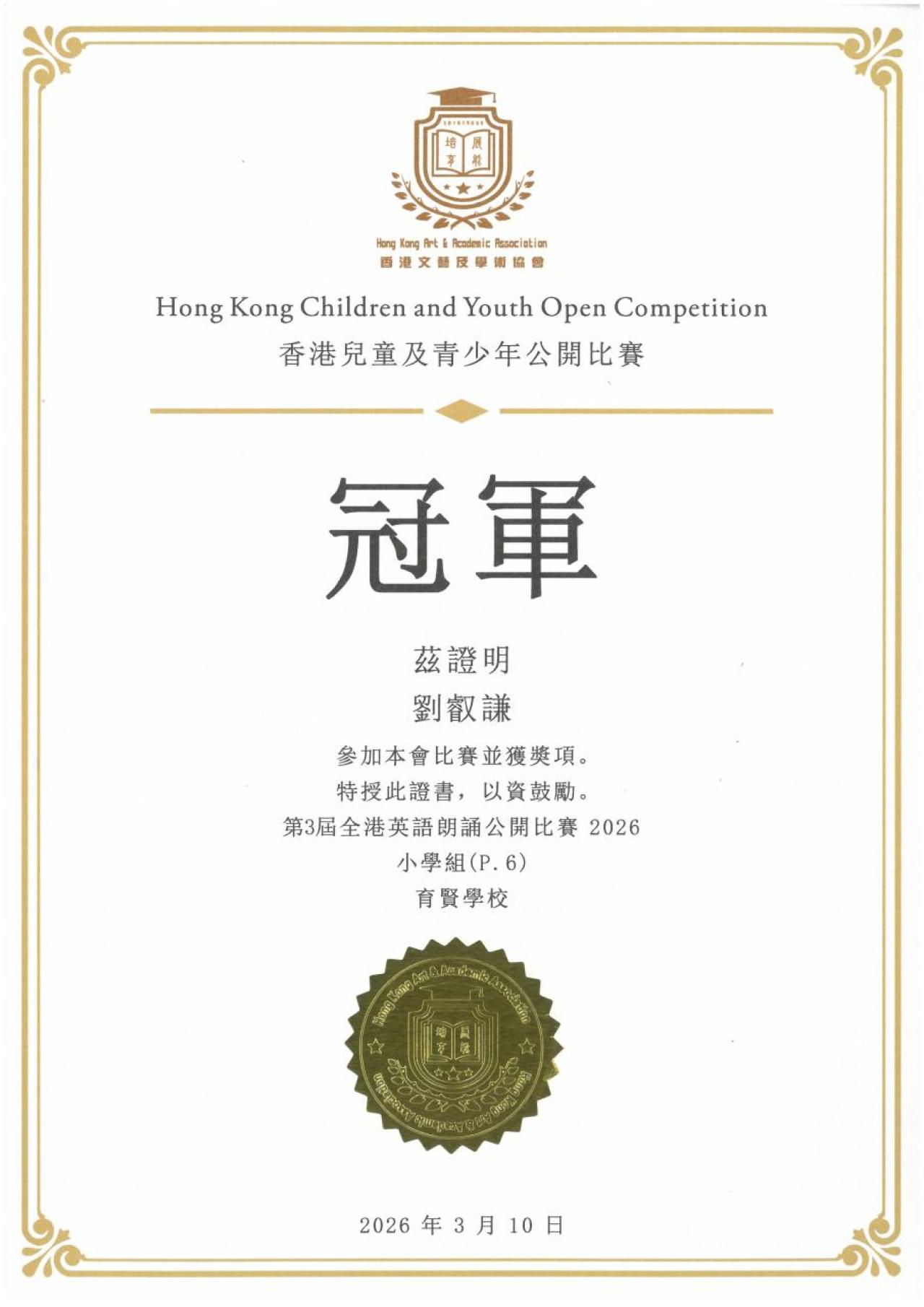 第三屆全港英語朗誦公開比賽2026 小學組